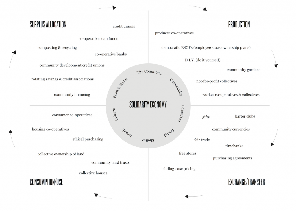 The U.S. Solidarity Economy Network defines a “solidarity economy” as an alternative framework for economic development grounded in practice of principles such as: solidarity and cooperation; multi-dimensional (or intersectional) equity; social and economic democracy; sustainability; pluralism; and people-planet first.